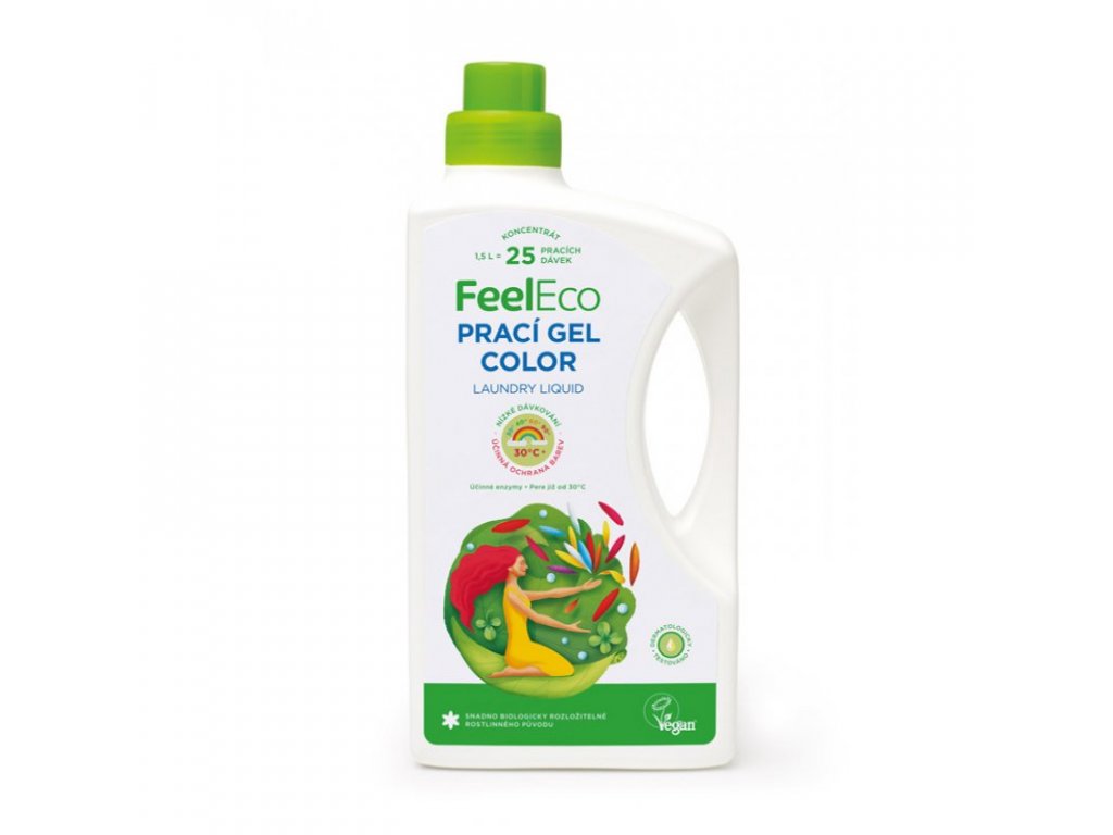 Feel eco prací gel color koncentrovaný tekutý prostředek určený k praní barevného a tmavého prádla. Díky svému koncentrovanému složení a vysokému obsahu enzymů je velmi účinný již při nízkých teplotách. Zároveň obsahuje složky, které chrání a oživují barvu praných textilií. Aktivní látky obsažené v pracím prostředku jsou rostlinného původu a jsou snadno biologicky rozložitelné. Prací gel není vhodný pro vinu a hedvábí.