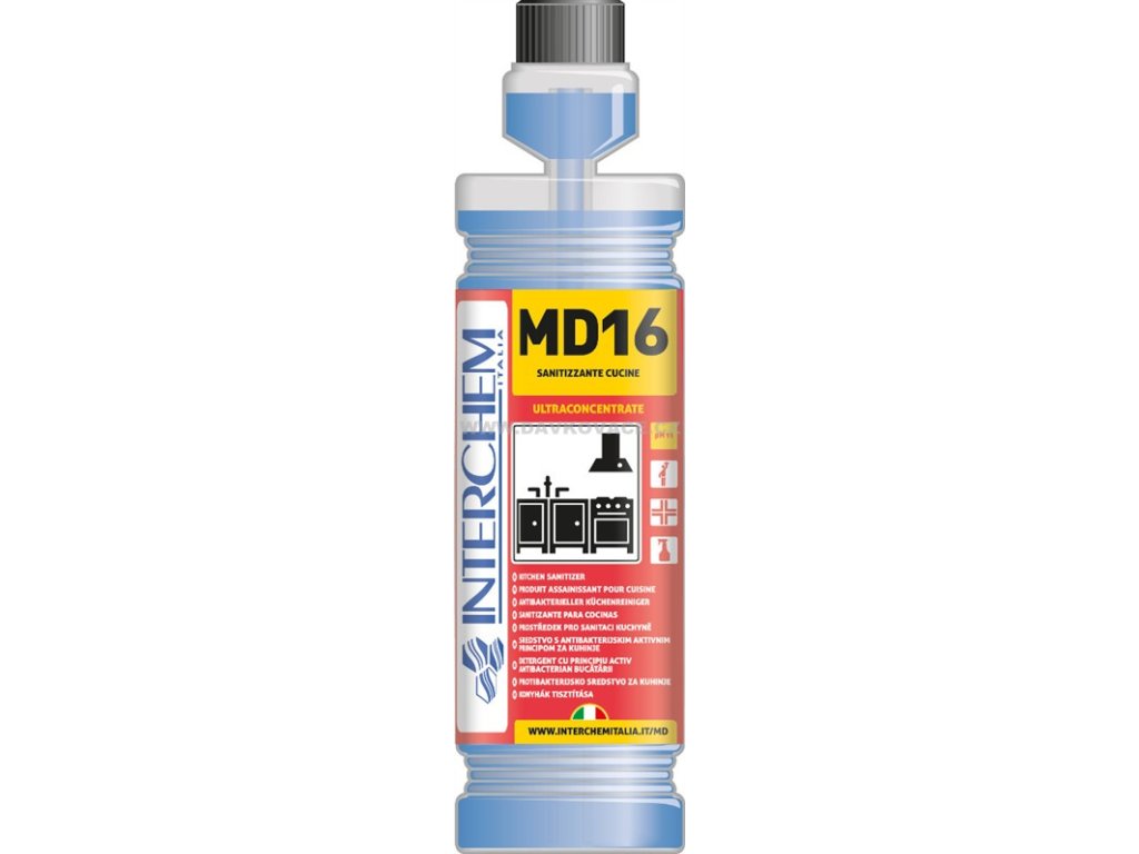 MD16 - láhev 1l - Ultra-koncentrovaný neparfémovaný detergent určený k přípravě roztoku k očistě a sanitizaci kuchyňských omyvatelných ploch. omyvatelných ploch. Vyhovuje H.A.C.C.P.