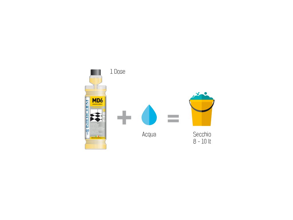 MD6 - láhev 1l - Super-koncentrovaný víceúčelový detergent určený pro očistu středně znečištěných podlah a jiných povrchů v kuchyních a koupelnách. Po použití jeho vůně přetrvává v prostoru několik hodin. Vhodný k ručnímu i ke strojovému použití.