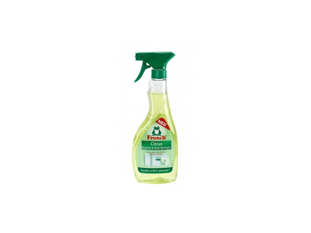 Frosch na koupelny a sprchy s přírodními kyselinami z citronů účinně odstraňuje vápenné usazeniny a zanechává svěží citronovou vůni. Obsažené tenzidy jsou z 98% biologicky odbouratelné do 28 dnů (primární odbouratelnost ve smyslu OECD testovací metody). Nepoužívejte na povrchy málo odolné vůči kyselinám jako mramor, vápence, dekorační keramiku a určité typy smaltu.