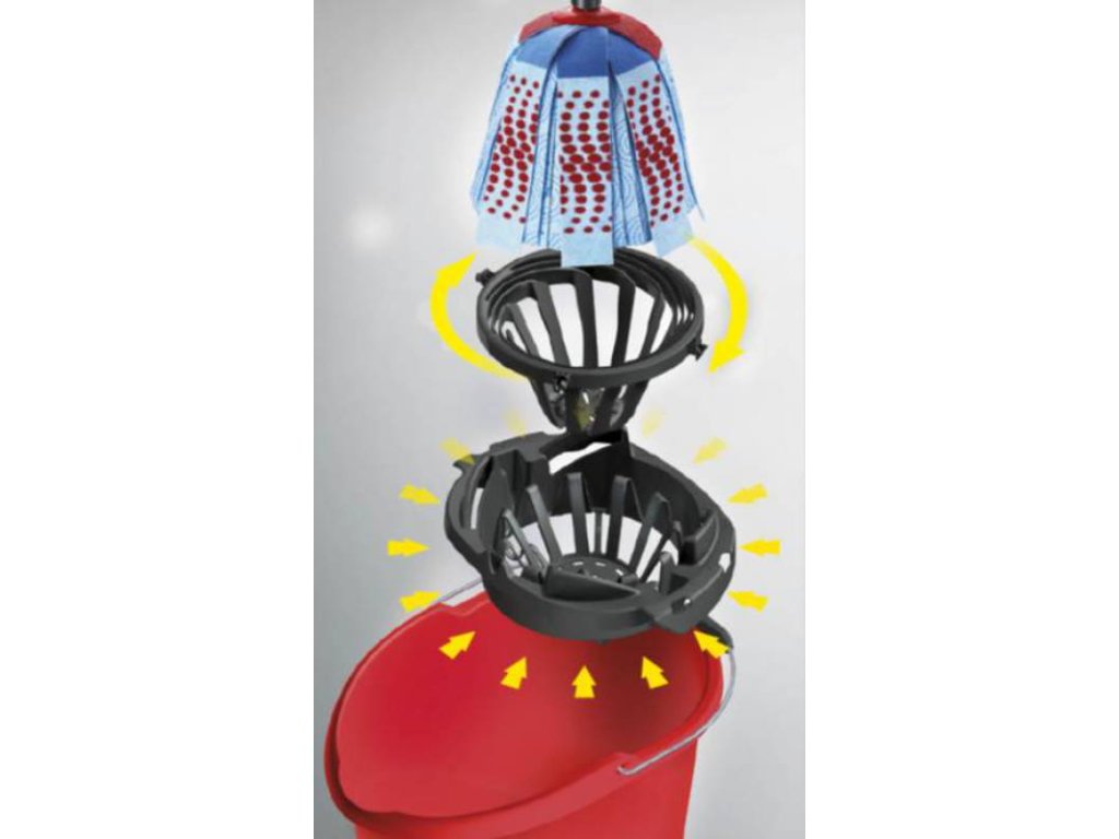 - Spirálový ždímač, který díky ždímání formou stlačení a nyní navíc díky kroucení ždímače, dokáže vyždímat mop ještě lépe.